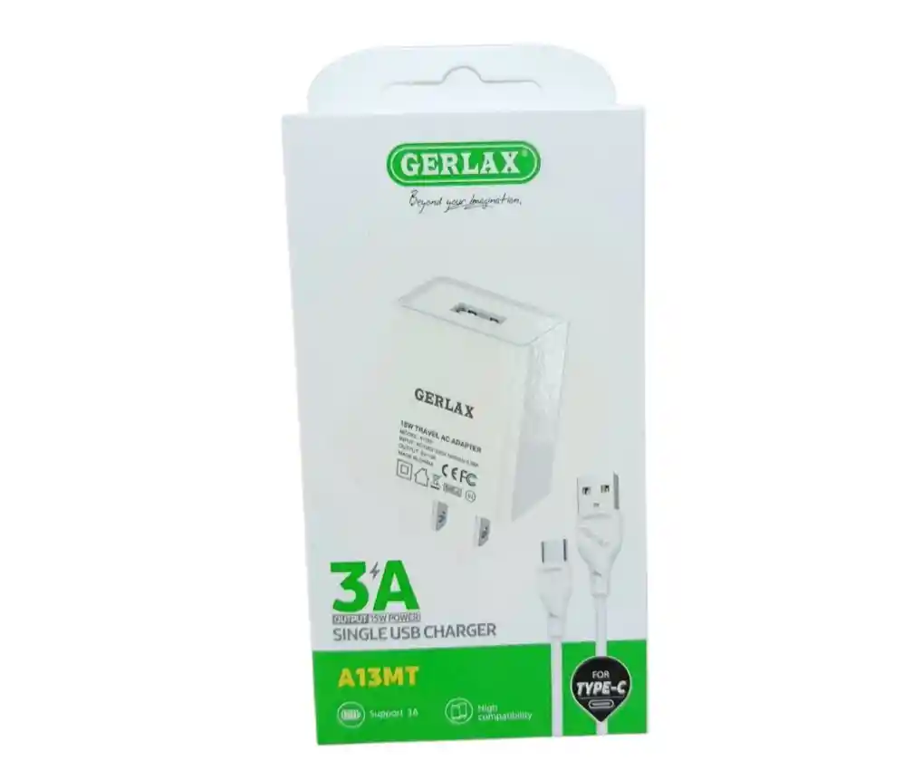 CARGADOR GERLAX Si lo que necesitas es mantener tus dispositivos cargados de forma rápida y segura, este cargador de pared Gerlax es la solución perfecta. Viene en una caja compacta y elegante que muestra claramente sus características principales.