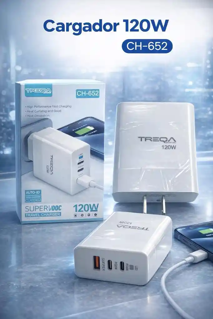 🔌⚡ ¡El cargador más potente del mercado! ⚡🔌 🔥 Cargador Súper Rápido 120W Carga tus dispositivos en tiempo récord con máxima potencia y seguridad. Perfecto para celulares, tablets y otros dispositivos electrónicos. ✅ Potencia real de 120W ✅ Carga súper rápida ✅ Múltiples puertos para cargar varios dispositivos ✅ Tecnología inteligente de protección ✅ Diseño compacto y moderno 📱 Ideal para quienes necesitan carga rápida y eficiente en cualquier lugar.