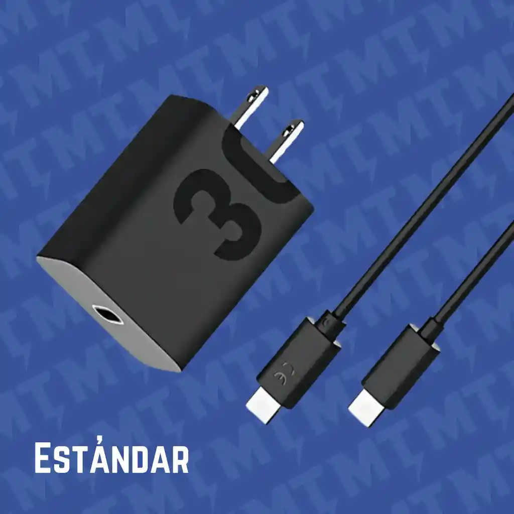 Cargador de 30W con carga rápida TurboPower. Incluye: - Adaptador con puerto USB-C. - Cable USB-C a USB-C. Calidad: Estándar.