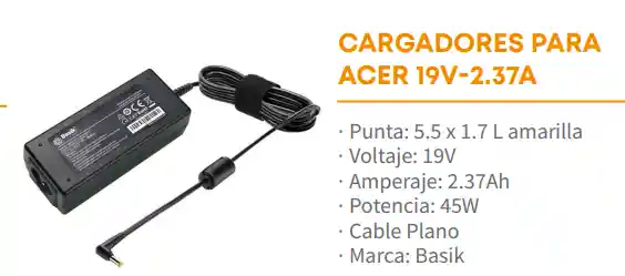 Punta: 5.5 x 1.7 L amarilla · Voltaje: 19V · Amperaje: 2.37Ah · Potencia: 45W · Cable Plano EXPOTECNOLOGIA 3505945136