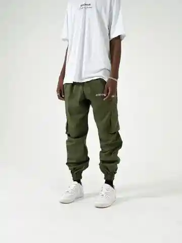 CARGO PANT UNISEX EN TELA DRIL DE COLOR VERDE CON BORDADO, ELÁSTICO EN LA CINTURA Y BOTA CON 2 BOLSILLOS LATERALES.