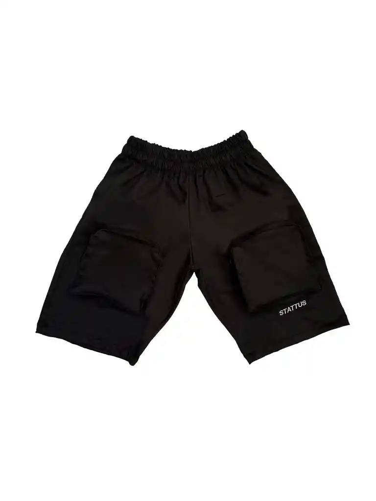 SHORT EN TELA POLIALGODÓN DE COLOR NEGRO , CON ELASTICO EN CINTURA Y 2 BOLSILLOS TIPO CARGO CON CIERRE EN EL FRENTE Y BORDADO.