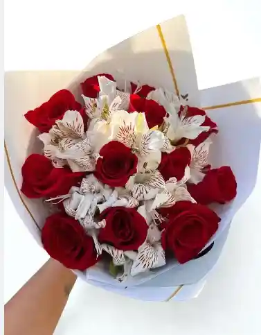 Bouquet con aprox. 12 rosas rojas y 1 paquete de astromelia blanca. Nota: La flor puede ser sustituida dependiendo la disponibilidad de color y del producto “Mensaje Personalizado” máximo de 30 caracteres (Dejar el mensaje en el chat, los comentarios no se previsualizan para la tienda por lo que si se dejan allí no podrá ser incluido).