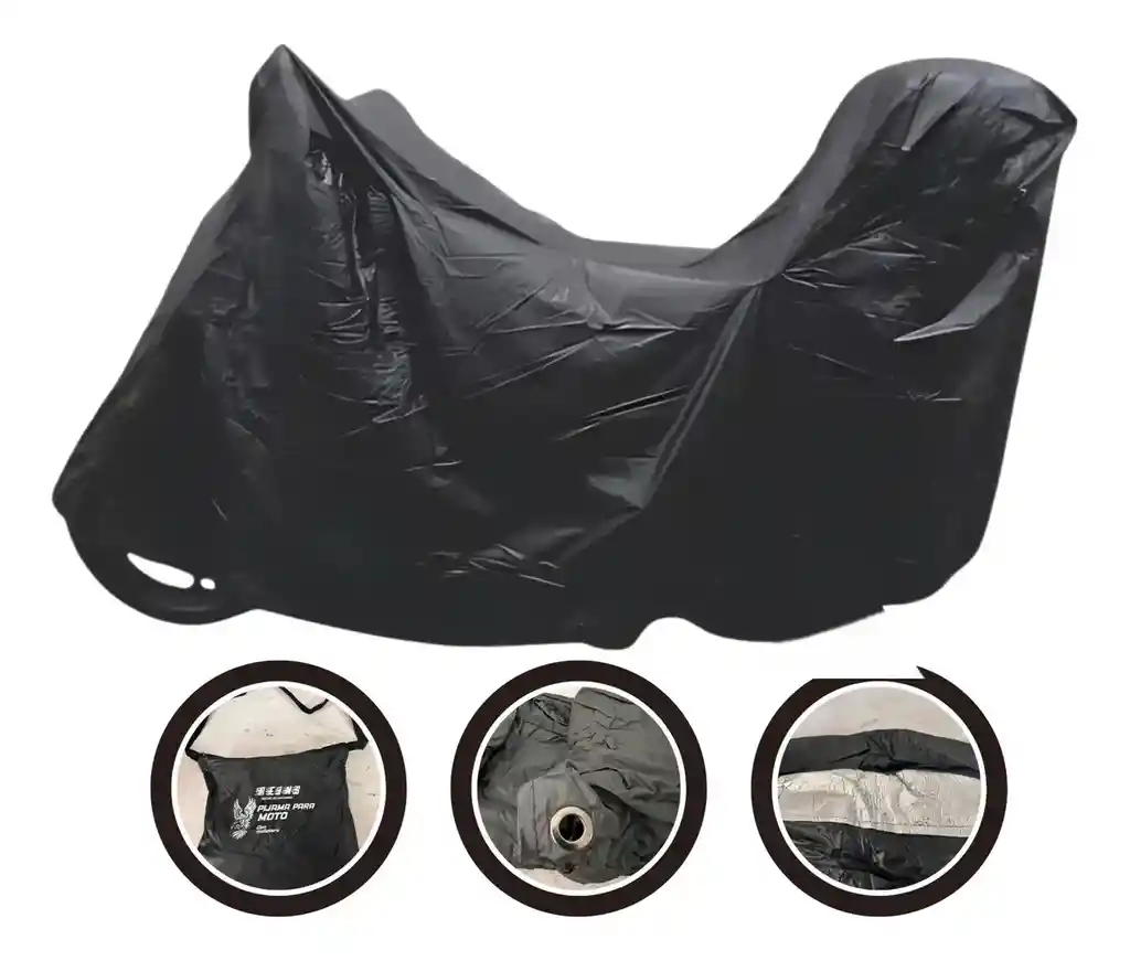 Protege contra el polvo, la lluvia ligera y el sol. Incluye un bolso para guardarla fácilmente cuando no está en uso. Cuenta con características como hebilla de seguridad para evitar robos y resorte para un ajuste firme. Material: Está fabricada con materiales semi-impermeables de alta calidad, como nailon o tela antifluido, que repelen el polvo, la suciedad y la humedad ambiental. Resiste lluvias suaves, pero no lluvia prolongada o fuerte, ya que no es 100% impermeable. Protección: Ofrece protección contra la exposición solar (incluyendo cierta protección UV), bajas temperaturas y rayones, sin deformarse. Diseño: Cuenta con un corte especial diseñado para adaptarse a motos con maletero o baúl, cubriendo uniformemente desde el baúl hasta debajo de las llantas. Seguridad: Incluye argollas metálicas antirrobo en la parte delantera para asegurar la pijama con un candado o guaya (algunas versiones incluyen la guaya con llave). Practicidad: Es ligera, fácil de instalar y de guardar, e incluye un bolso o tula de almacenamiento para un transporte cómodo.