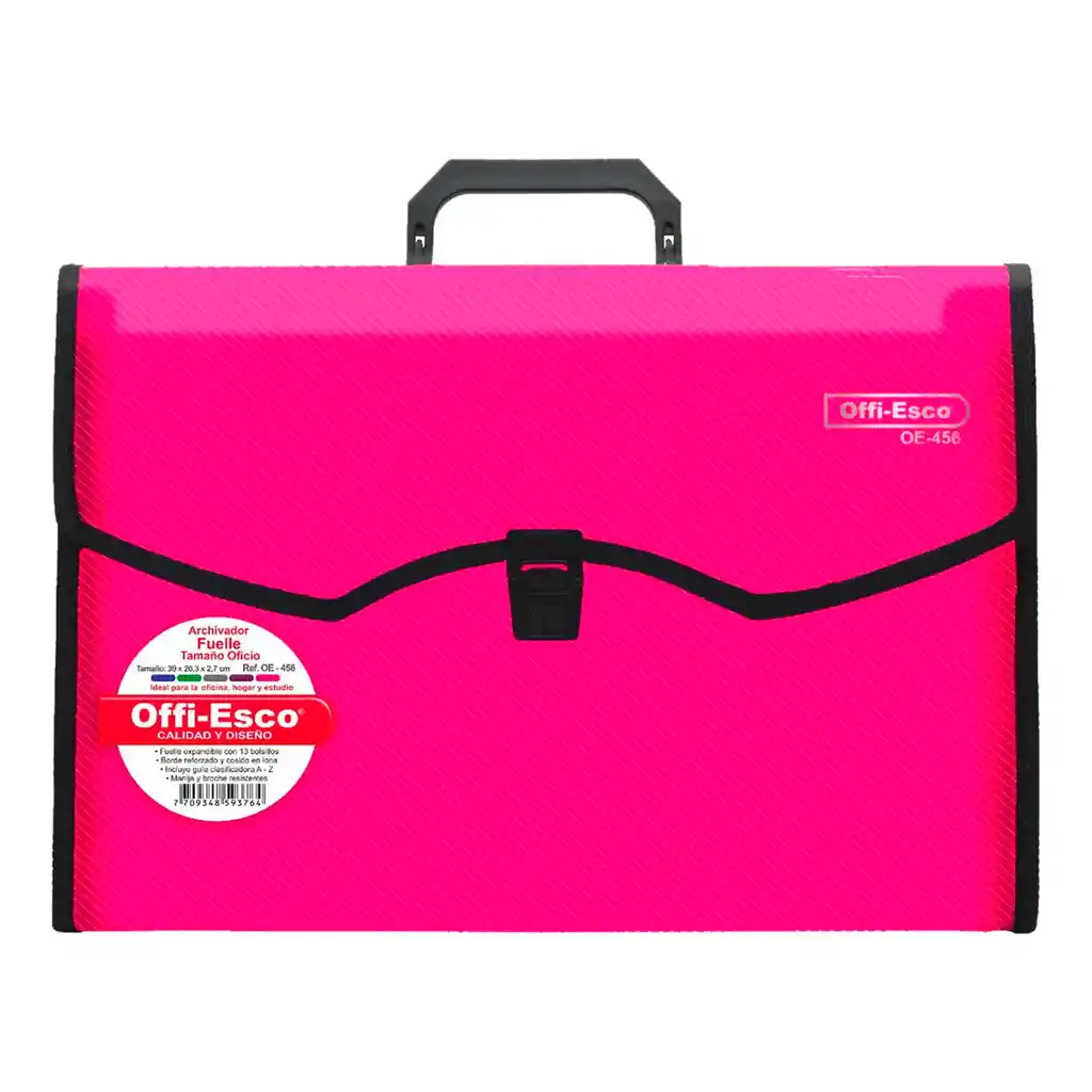 Archivador 13 bolsillos oficio translúcido Tamaño oficio 39×26,3x 2,7 cm Ideal para la oficina, hogar y estudio Fuelle expansible con 13 bolsillos Borde reforzado y cosido en la lona Incluye guía clasificadora A-z Manija y broche resistentes Disponible en Colores Translucidos: Fucsia, Negro, Morado, Verde y Azul.