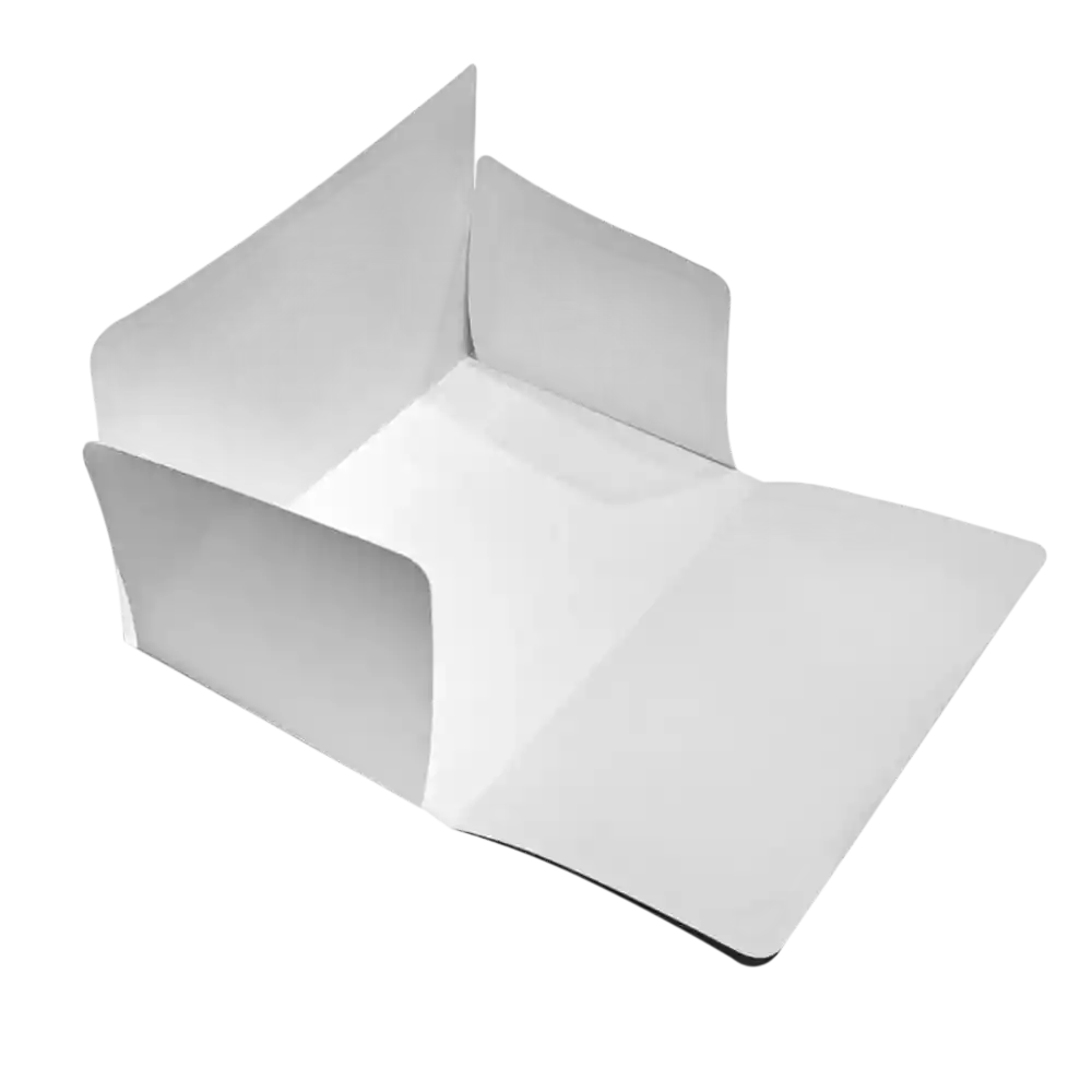 CARPETA TAMAÑO OFICIO COLOR BLANCO 4 ALETAS Consta de una cubierta anterior y una posterior con solapas laterales que doblan al interior. Incluye grafado para 4 pliegues sobre cada solapa. La distancia entre los pliegues es de 1 cm., para obtener diferentes capacidades de almacenamiento.