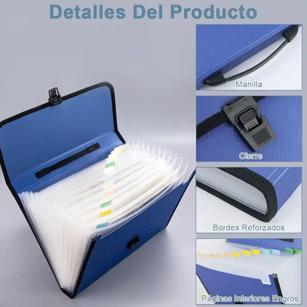 Capacidad para hasta 400 hojas, ideal para grandes volúmenes de documentos. Diseño de 13 bolsillos para una organización eficiente. Fabricada en plástico PP sin ácido y resistente al agua. Asa retráctil para un transporte cómodo y seguro. Cierre de hebilla elástica que mantiene los documentos seguros. Incluye etiquetas preetiquetadas para una rápida identificación.