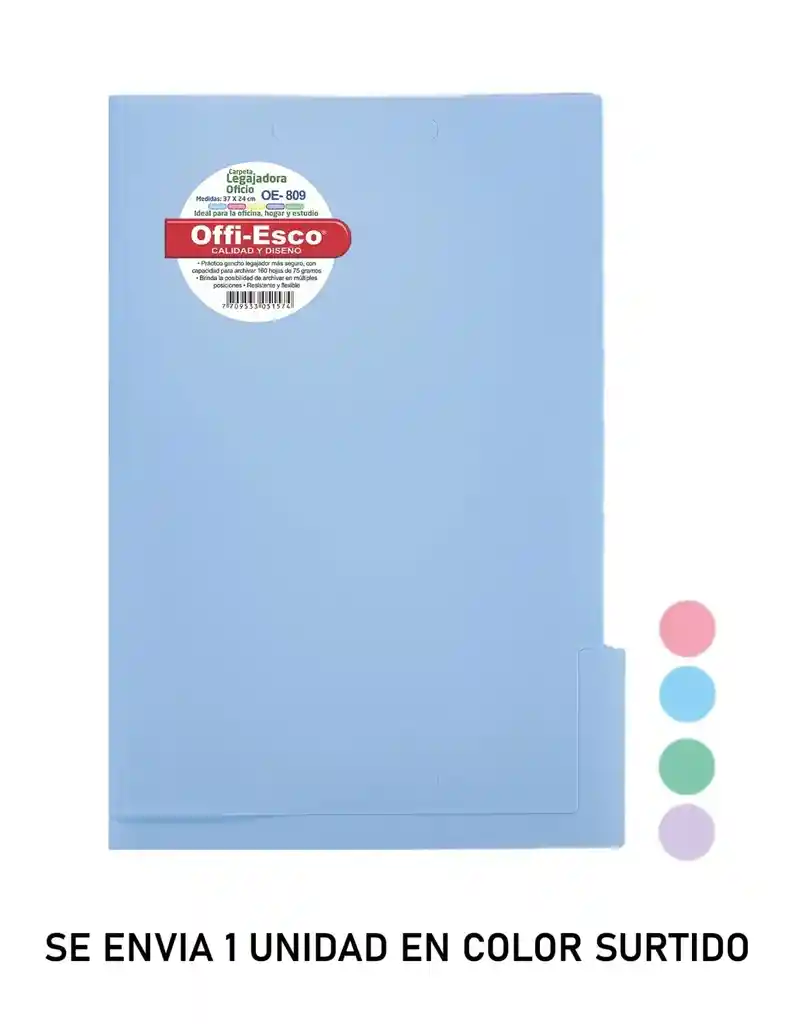 Carpeta legajadora Plastica tamaño oficio. Viene con gancho Legajador, en colores surtidos, tonos pastel. Marca offi esco Se envia 1 unidad en color surtido de acuerdo a disponibilidad.