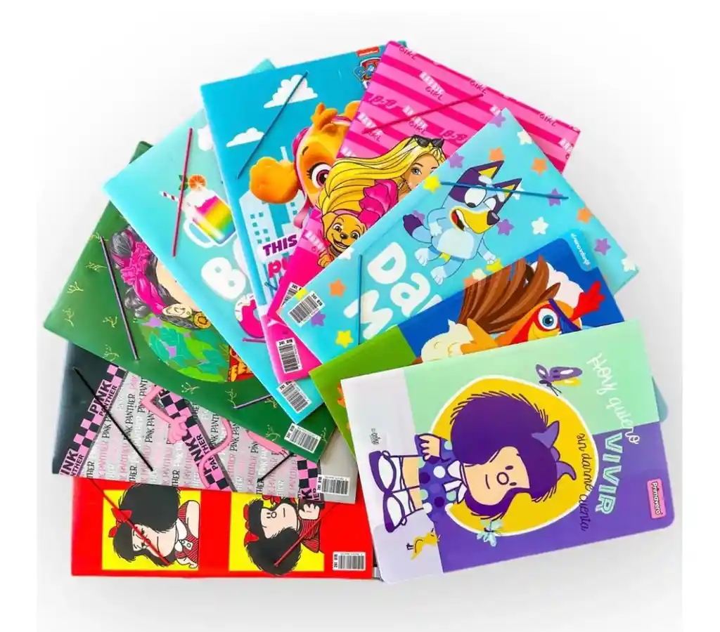 Fabricada en plástico resistente de 37 x 26 cm, esta carpeta tipo liga tiene impresión por ambas caras y un cordón elástico de color que mantiene los documentos organizados. Su acabado brillante resalta los detalles y colores de los personajes, convirtiéndola en una pieza llena de vida