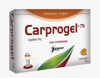 Indicado en perros para el tratamiento del dolor y la inflamación asociado a osteoartritis, para el control postquirúrgico asociado al sistema osteoarticular y musculoesquelético. Este medicamento es únicamente administrado vía oral. No tiene contraindicaciones conocidas hasta el momento. Composición: Carprogel 75_____________ Carprofeno 75 mg Precauciones: Uso Veterinario. Venta bajo fórmula del Médico Veterinario. Manténgase fuera del alcance de los niños y animales domésticos. Almacénese en un lugar fresco, seco y protegido de la luz a una temperatura no mayor de 30°C. Signos gastrointestinales leves como efectos adversos. Pacientes que reciben tratamiento diurético, o presentan trastornos de función hepática o renal o cardiovascular, requieren abordarse con precaución y monitorio constante. Evitar utilizar el medicamento en perros hipotensos, hipovolémicos y deshidratados por aumento del riesgo de toxicidad renal.