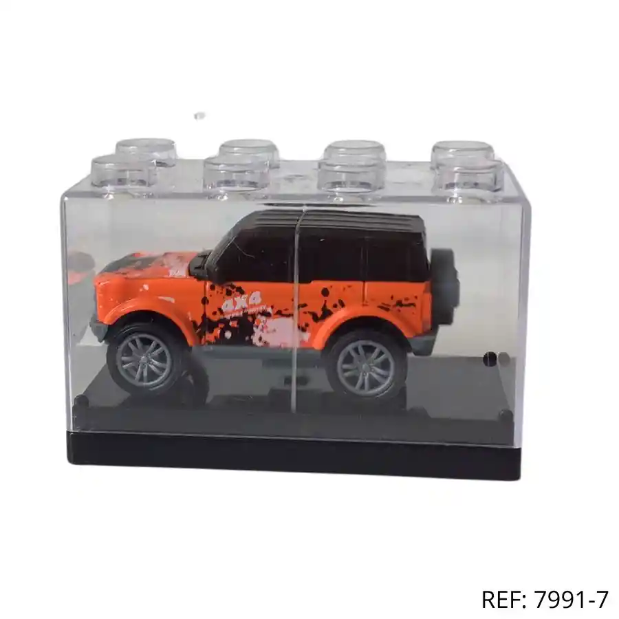 Camioneta 4x4 naranja con diseño de aventura. Ideal para coleccionar o jugar. Viene en estuche tipo bloque.