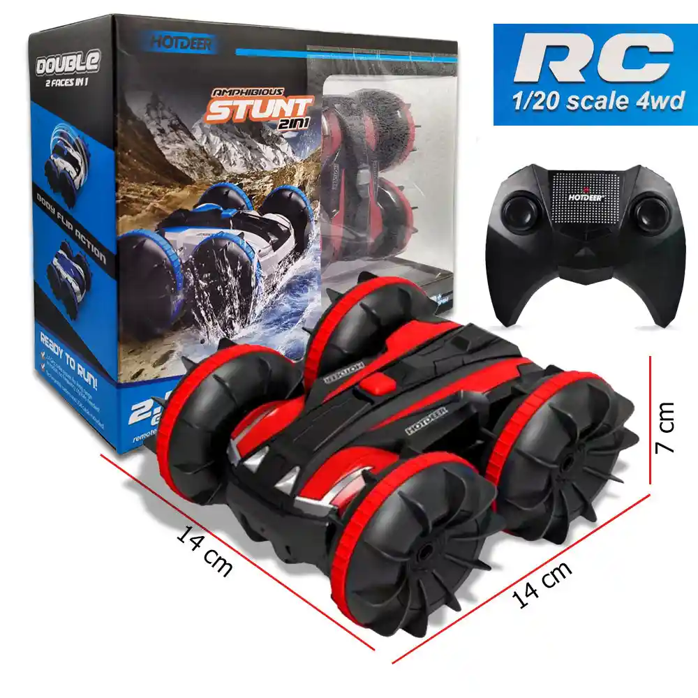 CARRO A CONTROL REMOTO ANFIBIO STUNT 2IN1 El juguete ideal para que tu pequeño desate toda su energía y alegría manipulando este espectacular coche que puede pasar por agua tierra o hielo y no tendrá barrera, ya que con sus llantas adaptadas para estos difíciles caminos y con la capacidad de girar su cabina en 360° no tendrá limites. 1. Velocidad de conducción: 10 + KMH 2. Método de carga: USB 3. Distancia de control remoto: 60-80 metros 4. Batería de control remoto: AAx2 (no incluida) 5. Escenas de conducción: rocas, arena, hierba, colinas, agua 6. Conducción en 4 ruedas con salida fuerte, ambos lados se pueden conducir tanto en positivo como en negativo 7. Capacidad de escalada de 45 grados, sin miedo a todo tipo de terreno. 8. Neumáticos de goma todoterreno de gran diámetro, compresivos y resistentes al desgaste, agarre fuerte 9.Señal estable de 2.4G, control remoto de larga distancia, competencia multijugador sin interferencias 10. Tamaño: tamaño pequeño 14x14.6x7.1 cm, tamaño grande 14x21x7.1 cm 11. Peso: alrededor de 480 gramos. Medidas Empaque: 22 cm de Alto x 30 cm de Largo x 10 cm de Ancho. Medidas Carro: 7 Cm de Alto x 14 cm de Largo x 14 cm de Ancho. Material: Plástico y Goma.