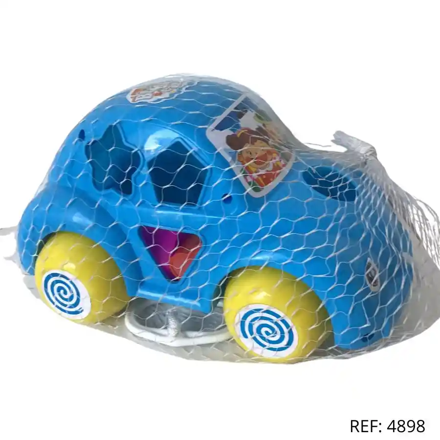 Carro didáctico azul con figuras encajables, ideal para estimular la motricidad y aprendizaje de los más pequeños. ¡Muy divertido!