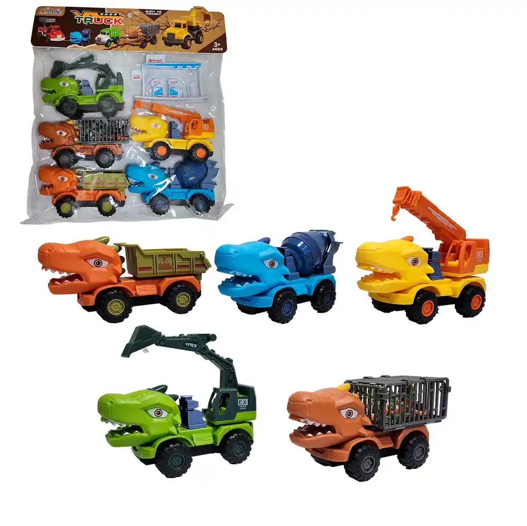¡Ruge de emoción y prepárate para una obra de construcción jurásica con nuestro increíble Set de Dino Camiones! Esta poderosa flota de vehículos de fricción combina la fuerza de la maquinaria pesada con el poder feroz de los dinosaurios, incluyendo una excavadora, un camión de volteo, una mezcladora de cemento, una grúa y hasta un transportador con jaula, ¡cada uno con el impresionante rostro de un dinosaurio! Perfectos para crear las aventuras más salvajes, desde excavar fósiles hasta construir un parque prehistórico, este set que incluye también una estación de servicio, enciende la imaginación y garantiza horas de juego robusto y creativo. ¡Es el regalo ideal para los pequeños amantes de la construcción y los dinosaurios, uniendo dos mundos de diversión en una épica aventura! Ficha Técnica: Material : Plástico ABS Edad Apta + 3 años Dimensiones : 13 cm x 5 cm x 5 cm Referencia: 991-3 Certificado de conformidad: E5-0359-2021 ** _Para defectos de fábrica o retractos: \_Por favor revise el producto apenas lo reciba y antes de usarlo. No aplican ley de retracto o defectos de fábrica luego de usar el producto. Se manejan máximo 5 días para reportar defectos de fábrica (por ejemplo, producto funciona mal, piezas faltantes, rotas, etc). Para hacer efectiva la devolución el producto debe devolverse con el empaque original, el cual debe estar en buen estado, incluir todos los documentos y las partes completas y sin daños.