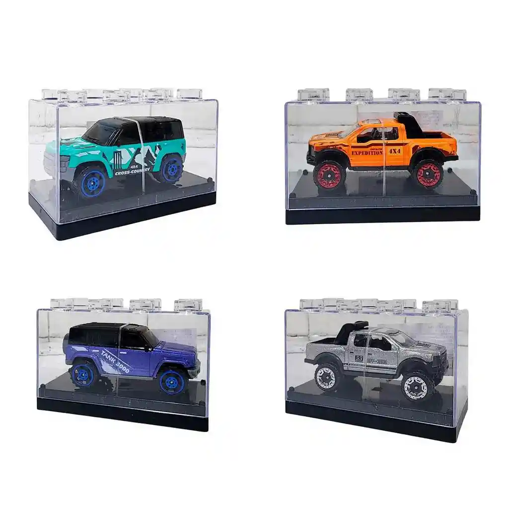 ¡Prepárate para la aventura todoterreno y exhibe tu colección con estilo gracias a este increíble set de cuatro camionetas 4x4! Cada vehículo de este paquete cuenta con un diseño robusto y detallado, listo para conquistar los terrenos más difíciles durante el juego. Pero lo que hace a este set verdaderamente especial es que cada camioneta viene protegida en su propia vitrina de exhibición individual, transparente y ¡apilable! Gracias a su diseño único tipo bloque, puedes construir una torre con tus modelos favoritos para mantenerlos impecables y a la vista. Es la combinación perfecta de juego y colección, ideal para los pequeños aventureros que aman la acción y también disfrutan mostrando sus tesoros. Ficha Técnica: Material: Metal / Plástico ABS Dimensiones: 7 cm x 3 cm x 3 cm Apto para: + 3 Años Referencia: 786-2A Certificado de conformidad: CS-LCO-13233-2021S2/432 ** _Para defectos de fábrica o retractos: \_Por favor revise el producto apenas lo reciba y antes de usarlo. No aplican ley de retracto o defectos de fábrica luego de usar el producto. Se manejan máximo 5 días para reportar defectos de fábrica (por ejemplo, producto funciona mal, piezas faltantes, rotas, etc). Para hacer efectiva la devolución el producto debe devolverse con el empaque original, el cual debe estar en buen estado, incluir todos los documentos y las partes completas y sin daños.