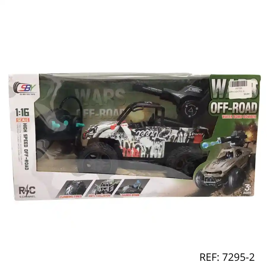 Carro RC estilo militar con lanzador de agua. Ideal para aventuras y juegos al aire libre.
