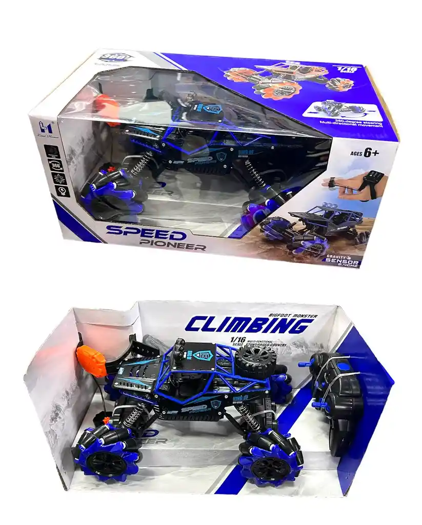 Espectacular Carro 4x4 Sensor Manejo Movimiento Mano a control remoto batería recargable Si buscas un juguete espectacular, de la mejor calidad y que garantizara la entera diversión de tus hijos, entonces estas en el lugar indicado y este es el juguete ideal. CARACTERÍSTICAS 1. Material plástico resistente y brillante 2. Opera con control remoto inalambrico 3 Función: conducción 4x4, avance, retroceso, giro a la izquierda, giro a la derecha. 4Juguete eléctrico con amortiguación en las cuatro ruedas 5Un regalo ideal para niños y niños a los que les gustan los juguetes de control remoto. Permítales tener un auto elegante y disfrutar de su tiempo de juego. 6. El carro cuenta con baterías recargables incluidas 7. Desde la manilla puede controlar el carro y lo si hay obstáculos mas grandes este carro se transformar en un 4x4 para que pueda pasar ese obstáculo. 8. Tiene dirección para adelante, derecha, izquierda y para atrás desde el mando 9. 15 Metros de alcance 10. Vehículo colores vivos 11. Control opera con tes baterías AA (NO INCLUIDAS) COLOR AZUL NARANJA CAJA EMPAQUE: LARGO: 36 cms ANCHO: 19 cms ALTO: 18 cms CARRO 4X4 : LARGO: 28 cms ANCHO: 17 cms ALTO: 15 cms CONTENIDO DE SU COMPRA 1. Carro 4x4 Sensor Manejo Movimiento Mano 2. Control remoto inalámbrico 3. Baterías recargables del carro 4. Cargador baterías del vehículo de USB 5.Cargador baterias de la manilla tipo USB 6. Presentación en caja de lujo PORQUE TUS HIJOS MERECEN LO MEJOR, PRODUCTO GARANTIZADO