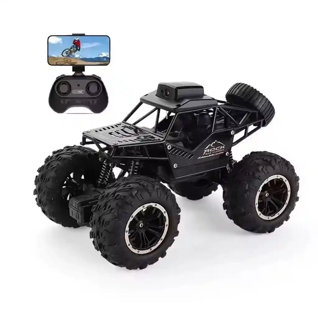 CARRO CONTROL REMOTO CAMARA Este potente vehículo off-road a control remoto (RC) está diseñado para escalar y conquistar los terrenos más difíciles. Su característica más destacada es la incorporación de una cámara que, junto con el soporte para smartphone en el control, permite una experiencia de conducción en Primera Persona (FPV - First Person View), haciendo el juego mucho más inmersivo ✨ Características Clave en Listado Estilo: ⛰️ Diseño robusto de Rock Crawler o Monster Truck, en color negro mate. Transmisión en Vivo (FPV): 📸 Cámara integrada en el techo que transmite video al smartphone del usuario. Control Remoto: 🎮 Incluye control remoto con soporte ajustable para sostener el teléfono móvil. Rendimiento Off-Road: ⚙️ Suspensión de alto recorrido y neumáticos gigantes con banda de rodadura agresiva, diseñados para escalar y pasar obstáculos. Construcción: Chasis estilo jaula de metal o plástico de alta resistencia para mayor durabilidad.