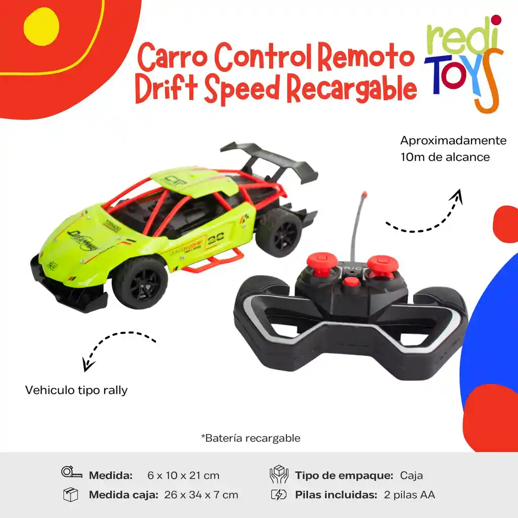 " Vehículo tipo rally Con 10 m de alcance aproximadamente. Diseño metálico, colores vibrantes y potente motor Batería recargable y adaptador Control ergonómico por su forma Colores surtidos CAJA:26 x 34 x 7 cm ARMADO: 6 x 10 x 21 cm"