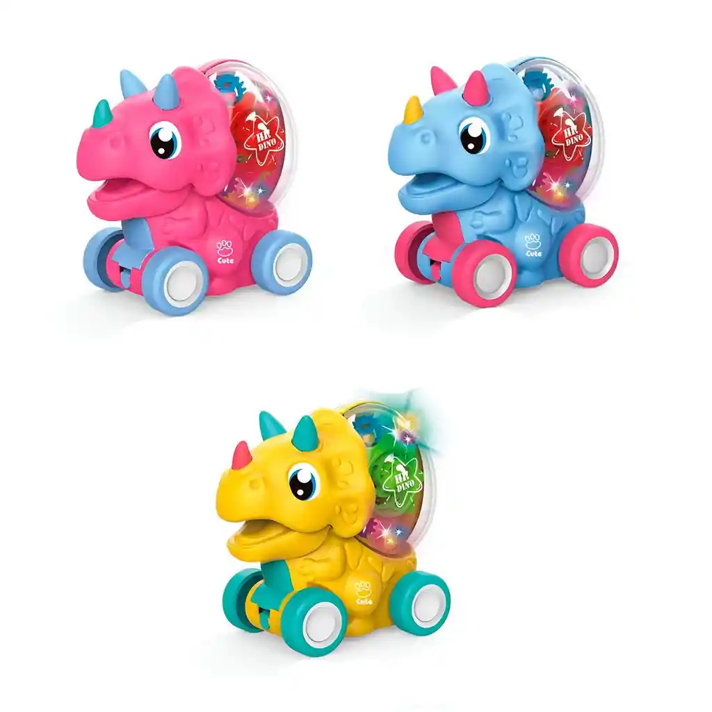 ¡Embárcate en una aventura prehistórica llena de luz y movimiento con nuestro adorable Dino Carrito con Engranajes! Este simpático triceratops no es un vehículo común; con un simple empujón, cobra vida de manera espectacular. La esfera transparente en su lomo se ilumina con luces LED de colores, revelando un fascinante espectáculo de engranajes que giran y se entrelazan, cautivando la curiosidad de los más pequeños. Diseñado para estimular los sentidos y la comprensión de la causa y efecto, este juguete es perfecto para animar a tu bebé a gatear y explorar mientras sigue a su brillante amigo. Su diseño robusto, colores vibrantes y carita amigable lo convierten en el compañero de juegos ideal para horas de descubrimiento y diversión luminosa. / El precio corresponde a tres carros asi como se aprecia en la foto / Ficha Técnica: Dimensiones: 11 cm x 10 cm x 6 cm Material : Plástico ABS Edad recomendada: + 3 años Certificado de conformidad: E5-0359-2021 Referencia: MH168-155 ** _Para defectos de fábrica o retractos: \_Por favor revise el producto apenas lo reciba y antes de usarlo. No aplican ley de retracto o defectos de fábrica luego de usar el producto. Se manejan máximo 5 días para reportar defectos de fábrica (por ejemplo, producto funciona mal, piezas faltantes, rotas, etc). Para hacer efectiva la devolución el producto debe devolverse con el empaque original, el cual debe estar en buen estado, incluir todos los documentos y las partes completas y sin daños.