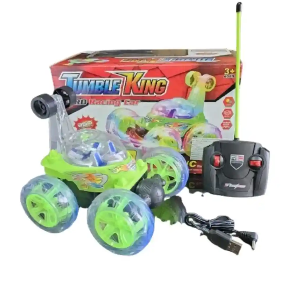 Carro Loco Recargable Control Remoto Acrobacias 360 Juguete Espectacular carro a control remoto con 15 metros de alcance, capacidad de giro de 360 grados,ideal para divertirse jugando con este vehículo durante horas dado que trae una bateria recargable de gran duracion, incluye luces en las llantas que le dan una hermosa apariencia y ademas trae un circuito emisor de sonidos que haran mas divertido interactuar con este. El vehiculo incluye en su parte delantera con un sistema de 360 grados que permite que pueda cambiar de direccion facilmente, hasta cuando este se encuentre de cabeza ya que incluye un par de llantas en la parte superior trasera que al apoyarse en estas pueda seguir andando y asi no tendra que parar de jugar para ir a reacomodarlo. CARRO LOCO NUEVO SIN CAJA INCLUYE: Cargador toma corriente a 110vt Control remoto inalambrico funciona con 2 pilas AA no incluidas