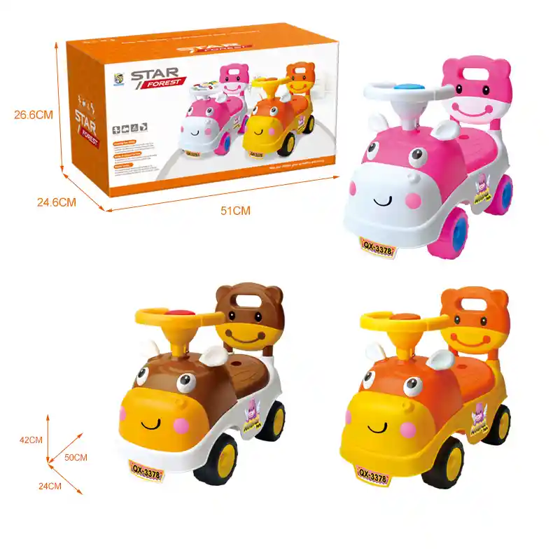 Carro montable en forma de animalito. Espaldar para mayor estabilidad y soporte. La tapa del sillín se levanta abriendo un espacio para guardar cosas. Pito Montar en un montable puede proporcionar una experiencia sensorial enriquecedora para los niños. Pueden experimentar diferentes texturas, sonidos y movimientos mientras juegan, lo que estimula sus sentidos y promueve el desarrollo sensorial.
