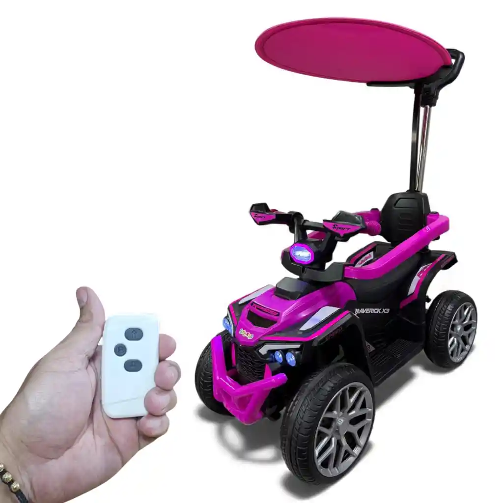 Carro Montable tipo Campero 3 en 1 ( Auto a batería, Carro de Empuje y Correpasillos) Pedal de aceleración para ser manejado por el niño (a), Barra de empuje con control de dirección,sistema de embrague para liberar motores cuando es empujado desde barra de empuje, Control remoto Inalámbrico 2.4 GH, BLUETOOTH para conectar música desde tu celular, Música incluida, Entrada USB y auxiliar, Barras de seguridad, Luces delanteras led, Aceleración gradual , 3 velocidades regulables desde el control remoto. Ayuda a tu bebé a desarrollar las habilidades motoras de sus PIERNAS, la coordinación, fuerza y de manera muy divertida. BAÚL debajo del asiento (cajón) para guardar los juguetes o llevar EL REFRIGERIO. Brinda diversión al momento de usarlo. El producto está hecho con materiales de alta calidad y por ende durabilidad. Es adecuado para esta etapa de exploración No pierdas esta gran oportunidad de tenerlo en tu casa. Ahora Alto del Piso a la Guía de empuje : 90 cm Dimensiones del producto : 72*40*42cm Fácil de limpiar Fácil de armar Resistentes al sol y la humedad Producto Liviano Su estilo es único y fácil de transportar Desarrollan las habilidades motrices Dirección giratoria Agarradera de empuje Ayuda al desarrollo de las habilidades motrices Fácil de transportar y llevar a todas partes Ideal para espacios cerrados y exteriores