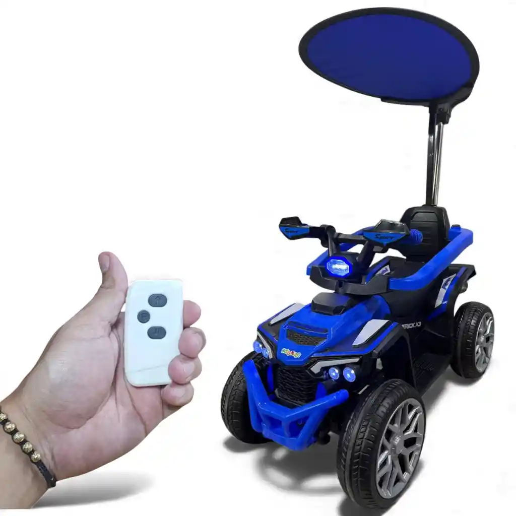 Carro Montable tipo Campero 3 en 1 ( Auto a batería, Carro de Empuje y Correpasillos) Pedal de aceleración para ser manejado por el niño (a), Barra de empuje con control de dirección,sistema de embrague para liberar motores cuando es empujado desde barra de empuje, Control remoto Inalámbrico 2.4 GH, BLUETOOTH para conectar música desde tu celular, Música incluida, Entrada USB y auxiliar, Barras de seguridad, Luces delanteras led, Aceleración gradual , 3 velocidades regulables desde el control remoto. Ayuda a tu bebé a desarrollar las habilidades motoras de sus PIERNAS, la coordinación, fuerza y de manera muy divertida. BAÚL debajo del asiento (cajón) para guardar los juguetes o llevar EL REFRIGERIO. Brinda diversión al momento de usarlo. El producto está hecho con materiales de alta calidad y por ende durabilidad. Es adecuado para esta etapa de exploración No pierdas esta gran oportunidad de tenerlo en tu casa. Ahora Alto del Piso a la Guía de empuje : 90 cm Dimensiones del producto : 72*40*42cm Fácil de limpiar Fácil de armar Resistentes al sol y la humedad Producto Liviano Su estilo es único y fácil de transportar Desarrollan las habilidades motrices Dirección giratoria Agarradera de empuje Ayuda al desarrollo de las habilidades motrices Fácil de transportar y llevar a todas partes Ideal para espacios cerrados y exteriores
