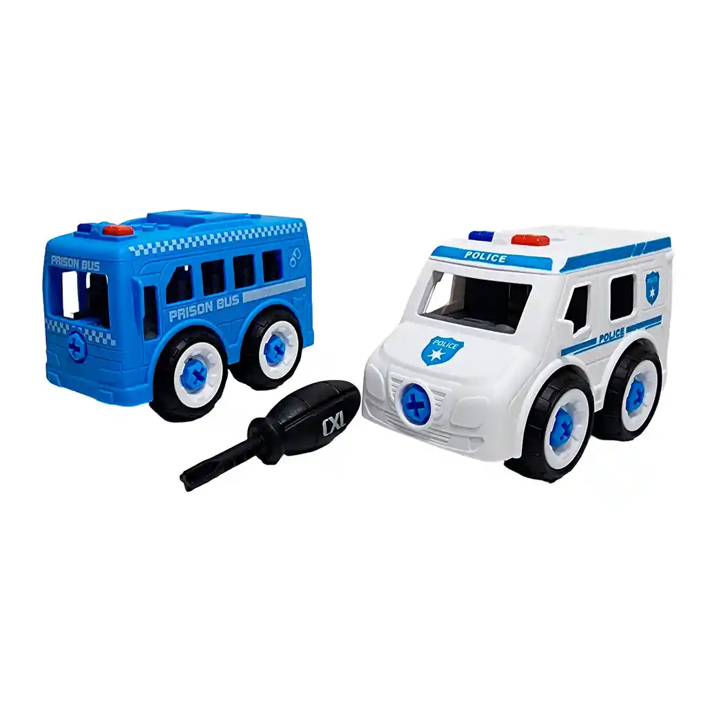 ¡Llama a tu equipo de élite para una doble misión de construcción y justicia con nuestro increíble Set de Vehículos Policiales para Armar! Este paquete de acción pone en manos de tu pequeño ingeniero y oficial de policía dos robustos vehículos: un autobús de prisioneros y una furgoneta blindada. Usando el destornillador incluido, los niños podrán disfrutar de la satisfacción de armar y desarmar sus propios coches, desarrollando la motricidad fina, la concentración y las habilidades de resolución de problemas. Una vez ensamblados, estos vehículos están listos para rodar en las persecuciones más emocionantes y las misiones de alto riesgo que su imaginación pueda crear. Es el regalo perfecto que combina la diversión de un taller mecánico con la trepidante aventura de mantener el orden en la ciudad. Ficha Técnica: Dimensiones : 11 cm x 7 cm x 7 cm Material : Plástico Edad apta para jugar: + 3 años Referencia: 18-6G Certificado de conformidad: SL-CS-210044 ** _Para defectos de fábrica o retractos: \_Por favor revise el producto apenas lo reciba y antes de usarlo. No aplican ley de retracto o defectos de fábrica luego de usar el producto. Se manejan máximo 5 días para reportar defectos de fábrica (por ejemplo, producto funciona mal, piezas faltantes, rotas, etc). Para hacer efectiva la devolución el producto debe devolverse con el empaque original, el cual debe estar en buen estado, incluir todos los documentos y las partes completas y sin daños.