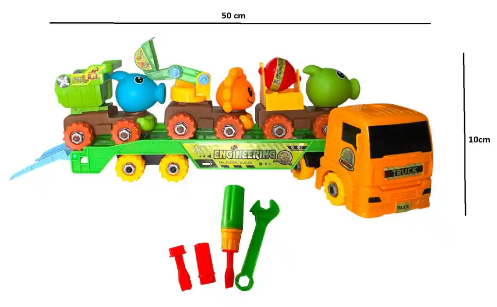 Este juguete es un set de camión transportador estilo "niñera" con vehículos de construcción armables. Incluye un camión grande para transportar y varios vehículos pequeños de construcción mas herramientas totalmente desarmables. Está diseñado para ser desarmado y vuelto a armar, fomentando habilidades motoras y creatividad en niños.