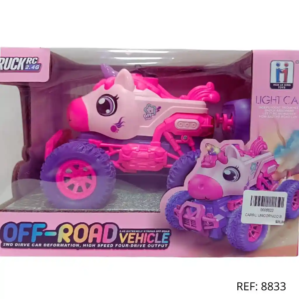 Carro de control remoto unicornio con luces LED, efecto de niebla, diseño todoterreno y estructura resistente. Ideal como regalo para niños.