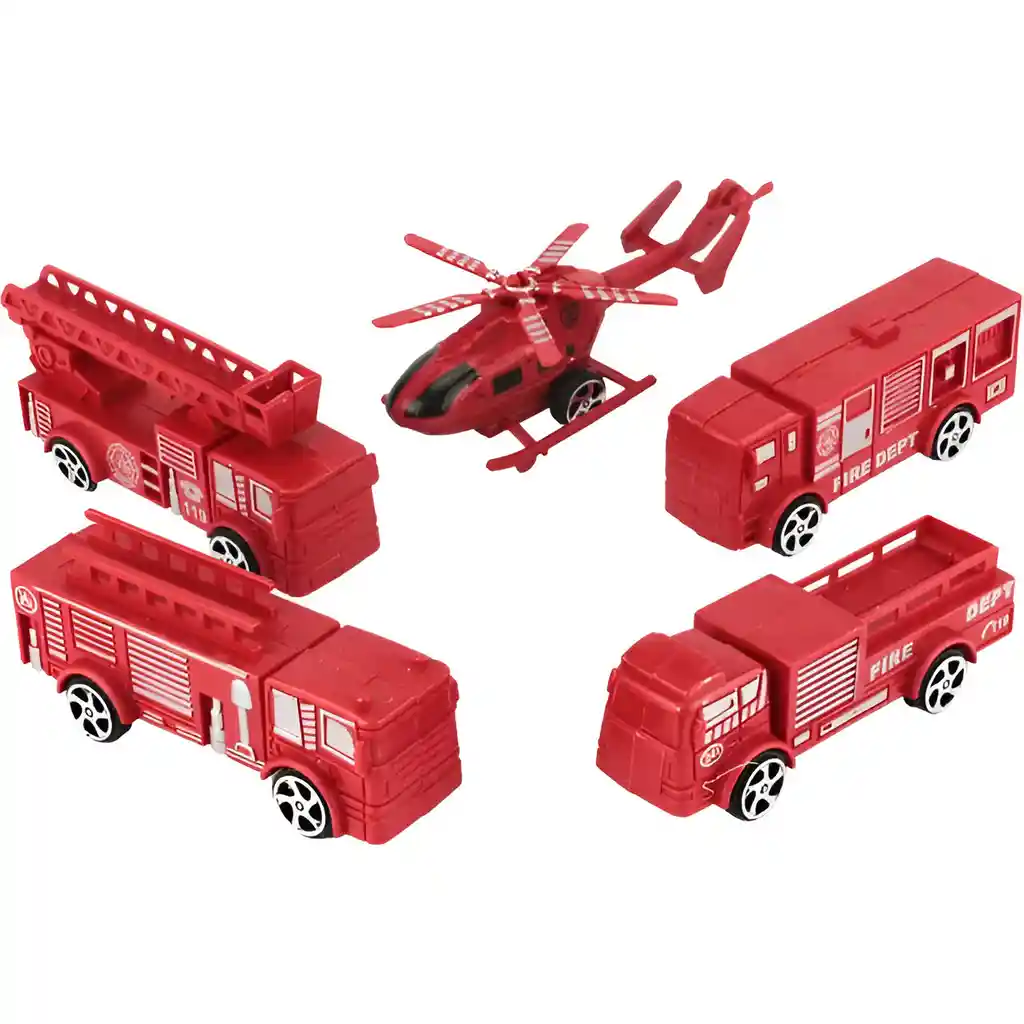 Esta colección de juguetes de bomberos incluye cinco vehículos de emergencia: camiones de bomberos detallados, autos de rescate rápidos y un helicóptero de intervención, diseñados para inspirar a los niños en sus aventuras de juego. Con colores llamativos y características realistas, como escaleras extensibles, ruedas giratorias y hélices móviles, cada unidad ofrece una experiencia interactiva llena de acción. Fabricados con materiales resistentes, estos juguetes fomentan la creatividad y el juego imaginativo, permitiendo a los pequeños recrear emocionantes misiones de rescate y aprender sobre el trabajo en equipo mientras se divierten. Ficha Técnica: Material: Plástico ABS No toxico Dimensiones de los carros: 7 cm x 4 cm x 3 cm Edad recomendada: + 3 años Referencia: BQ-94 Certificado de conformidad: CS-LCO-13233-2021S2/432 ** _Para defectos de fábrica o retractos: \_Por favor revise el producto apenas lo reciba y antes de usarlo. No aplican ley de retracto o defectos de fábrica luego de usar el producto. Se manejan máximo 5 días para reportar defectos de fábrica (por ejemplo, producto funciona mal, piezas faltantes, rotas, etc). Para hacer efectiva la devolución el producto debe devolverse con el empaque original, el cual debe estar en buen estado, incluir todos los documentos y las partes completas y sin daños.