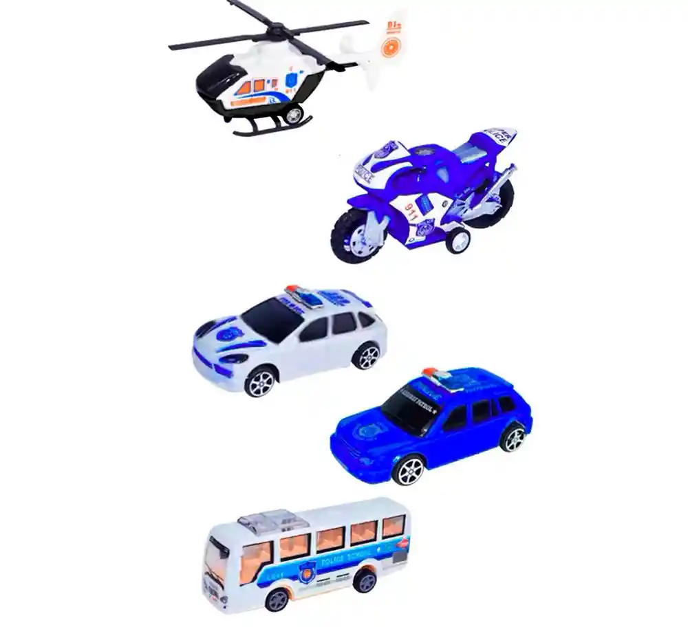 Descubre la emocionante colección de vehículos de rescate, que incluye un helicóptero, una moto, un autobús, y dos impresionantes camiones tipo grúa, todos diseñados para los más pequeños. Estos juguetes de impulso permiten a los niños recrear sus propias misiones de policia , proporcionando horas de diversión mientras desarrollan su imaginación y habilidades motoras. Cada vehículo está cuidadosamente diseñado con detalles vibrantes, ideales para aventuras de rescate llenas de acción. Ficha Técnica: Material : Plástico ABS no tóxico Edad Recomendada : 3 Años en adelante. Dimensiones : 14 cm x 4 cm x 7 cm Referencia: ve00102 Certificado de conformidad: CS-LCO-13233-2021S2/432 ** _Para defectos de fábrica o retractos: \_Por favor revise el producto apenas lo reciba y antes de usarlo. No aplican ley de retracto o defectos de fábrica luego de usar el producto. Se manejan máximo 5 días para reportar defectos de fábrica (por ejemplo, producto funciona mal, piezas faltantes, rotas, etc). Para hacer efectiva la devolución el producto debe devolverse con el empaque original, el cual debe estar en buen estado, incluir todos los documentos y las partes completas y sin daños.