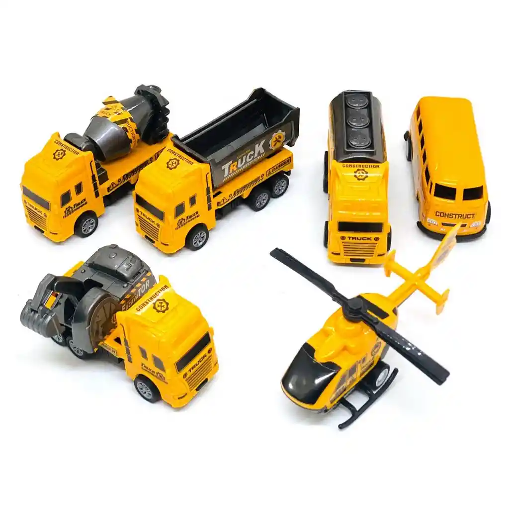 Descubre nuestra colección de camiones de construcción de juguete de 6 unidades, cada uno equipado con un sistema de cuerda asistido para añadir emoción y dinamismo al juego. Desde robustas excavadoras hasta potentes grúas y volquetes, estos vehículos están diseñados con detalles auténticos que fomentan la imaginación y el juego creativo. Perfectos para pequeños constructores, estos camiones ofrecen horas de diversión mientras los niños desarrollan habilidades motoras y se embarcan en grandes aventuras de construcción. ¡Una colección esencial para futuros ingenieros y aventureros! Ficha Técnica: Material: Plástico ABS Dimensiones del empaque: 39 cm x 12 cm x 4 cm Dimensiones vehículos : 8 cm x 6 cm x 4 cm Apto para niños + 3 Años Referencia: CRR21 399-458K Certificado de conformidad: CS-LCO-13233-2021S2/432 ** _Para defectos de fábrica o retractos: \_Por favor revise el producto apenas lo reciba y antes de usarlo. No aplican ley de retracto o defectos de fábrica luego de usar el producto. Se manejan máximo 5 días para reportar defectos de fábrica (por ejemplo, producto funciona mal, piezas faltantes, rotas, etc). Para hacer efectiva la devolución el producto debe devolverse con el empaque original, el cual debe estar en buen estado, incluir todos los documentos y las partes completas y sin daños.