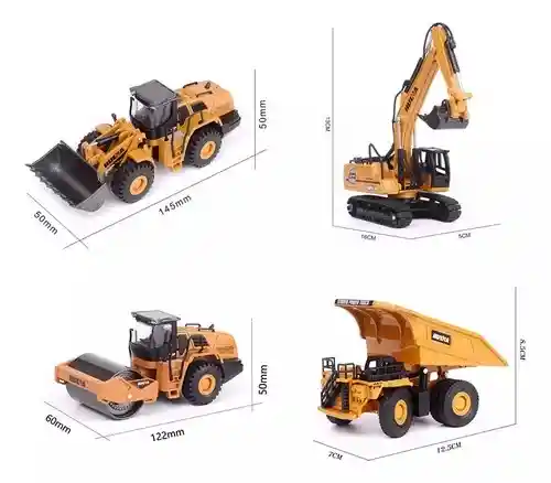 La maquina rodillo el rodillo es metalico La volqueta minera la partes de atras es metalico (posible error de escala) La Escavadora la pala es metalica , oruga de caucho , EL cargador pala metalica