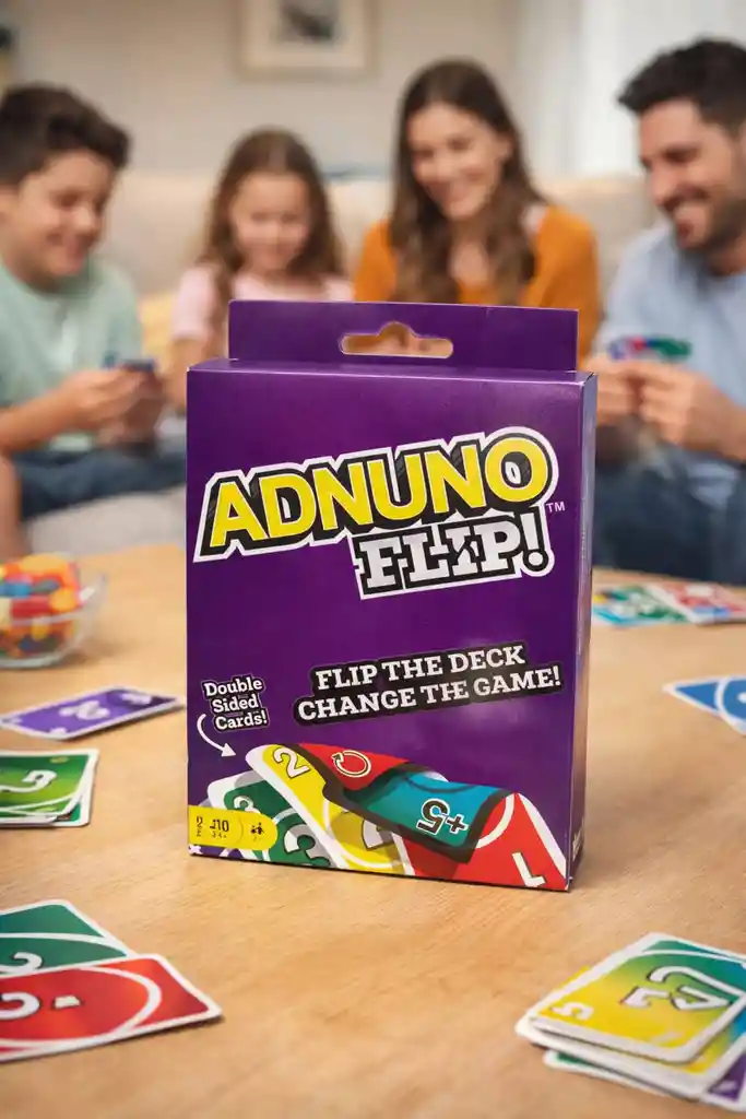 ADNUNO FLIP! es un juego de cartas dinámico, divertido y perfecto para compartir en familia. 👨👩👧👦 Para todas las edades: pueden jugar niños, adultos y personas mayores, lo que lo convierte en un juego ideal para reuniones familiares. 🔄 Cartas de doble cara: incorpora una mecánica innovadora donde el juego puede cambiar completamente al “dar la vuelta” al mazo. ⚡ Rápido y emocionante: partidas ágiles que mantienen a todos atentos y participando. 🎉 Fácil de aprender: reglas sencillas que permiten empezar a jugar en pocos minutos. 🧠 Estimula habilidades: fomenta la concentración, la estrategia y la toma de decisiones. 👫 Multijugador: ideal para grupos de 2 a 10 jugadores. 🏠 Perfecto para cualquier ocasión: en casa, picnic, viajes o reuniones. 👉 En resumen: es un juego pensado para unir generaciones y crear momentos divertidos en familia. 📜 Reglas básicas del juego 🎯 Objetivo Ser el primer jugador en quedarse sin cartas. 🃏 Preparación Baraja todas las cartas. Reparte 7 cartas a cada jugador. Coloca el resto del mazo en el centro (boca abajo). Voltea la primera carta para iniciar el montón de descarte. 🔄 Desarrollo del juego Los jugadores juegan en turnos (generalmente en sentido horario). En tu turno debes: Jugar una carta que coincida en color o número, o Usar una carta especial, o Robar una carta si no puedes jugar. 🔁 Cartas especiales (ejemplos) 🔄 Cambio de turno: invierte el orden del juego. 🚫 Salto: el siguiente jugador pierde su turno. ➕ Roba cartas (+): el siguiente jugador debe robar cartas. 🎨 Cambio de color: eliges el color que continúa. 🔃 FLIP (voltear): todos los jugadores voltean sus cartas y el mazo cambia completamente. ⚠️ Regla importante Cuando te quede una sola carta, debes anunciarlo (por ejemplo: “¡UNO!” o similar). Si no lo haces y otro jugador lo nota, puedes recibir penalización. 🏆 Fin del juego El primero en quedarse sin cartas gana la ronda. Opcional: se pueden sumar puntos según las cartas restantes de los demás jugadores.
