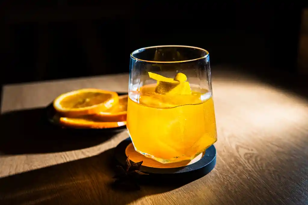 Mezcla de licor de esencias, zumo de naranja y Whisky.