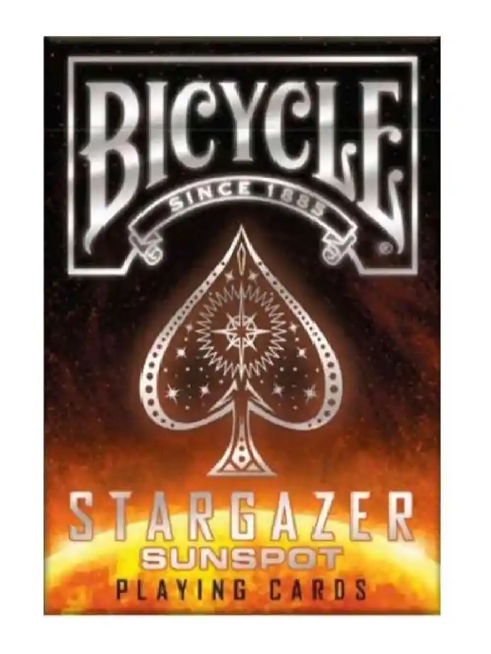 Los naipes Bicycle ® Stargazer Sun Spot presentan los colores vibrantes de la estrella en el centro de nuestro sistema solar conocido como el Sol. El diseño de la parte posterior de la tarjeta con una explosión de amarillo y fuego seguramente hará las delicias. El estuche le da vida a la vitalidad del sol con una lámina de plata reflectante.
