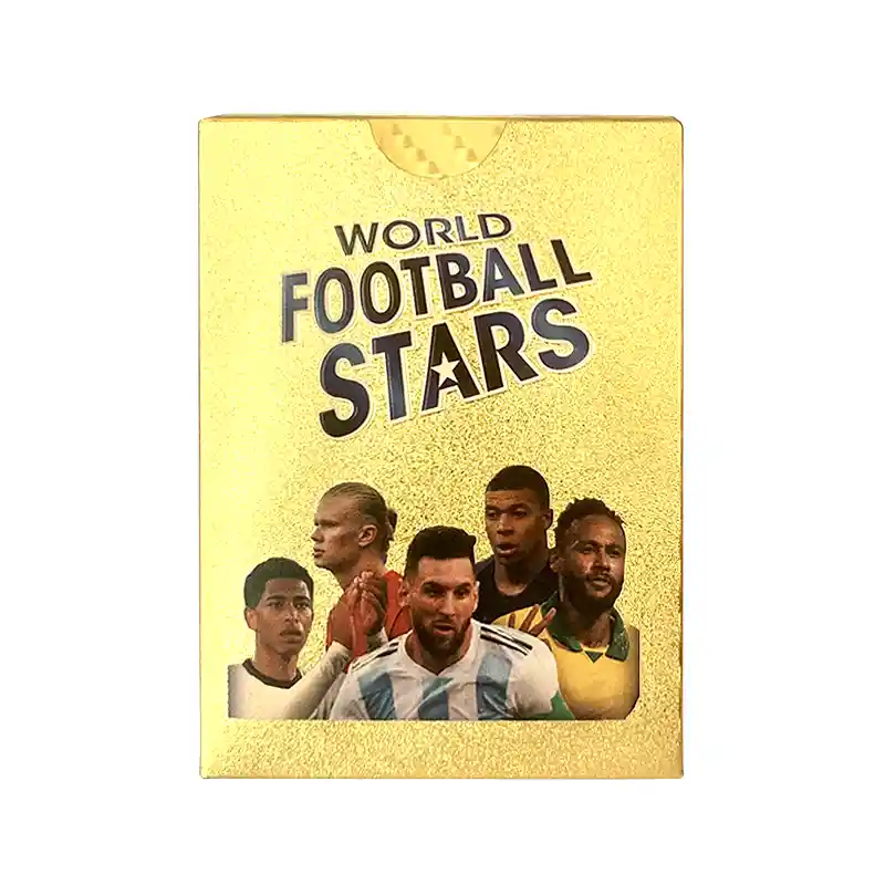 Cartas de Fútbol Coleccionables Intercambiables Incluye: 1 caja con 55 tarjetas Modelo: World Football Stars, edición limitada Color: Dorada Material: PVC de alta calidad Tamaño: 8.8 cm x 6.3 cm * Edición limitada con los mejores 55 jugadores de fútbol actuales. * Cartas especiales: Legend, Top Master, Rookie, Invincible, Titan y más. * Textura y acabado metalizado, que brinda un aspecto premium y una mayor durabilidad. * Regalo ideal para fanáticos y coleccionistas de fútbol, que buscan añadir piezas exclusivas a su colección. Nota: Marca Genérica. No son colección Panini.