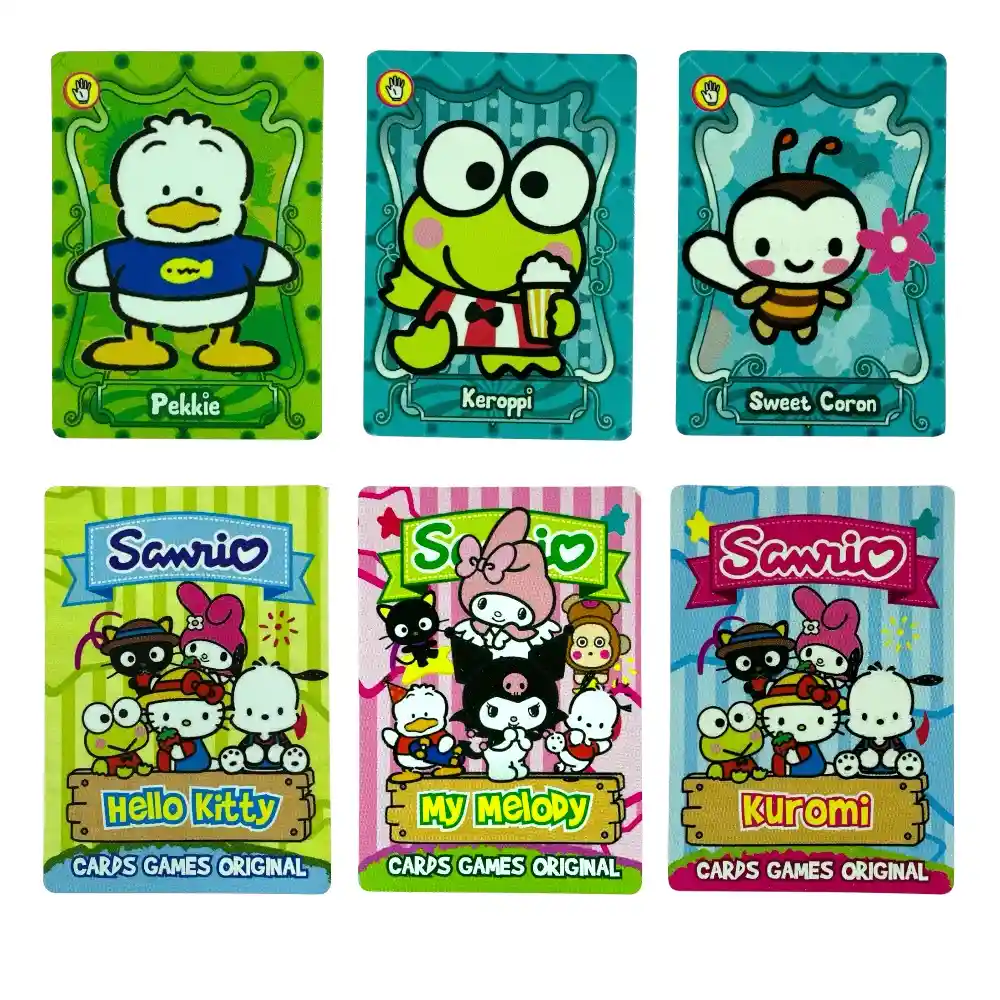Cartas de Juego Coleccionables - Sanrio Kawaii Incluye: 1 caja con 60 sobres de cartas (cada sobre contiene de 2 a 3 cartas, para un total de 120/180 cartas) Diseño inspirado en: Personajes Kawaii de Sanrio Colecciona las cartas más tiernas y coloridas de tus personajes favoritos de Sanrio, como Hello Kitty, My Melody, Kuromi y muchos más. Perfectas para coleccionistas y fans: ideales para intercambiar, coleccionar o disfrutar con amigos que aman el estilo kawaii. Marca: Genérica (No son colección Panini)