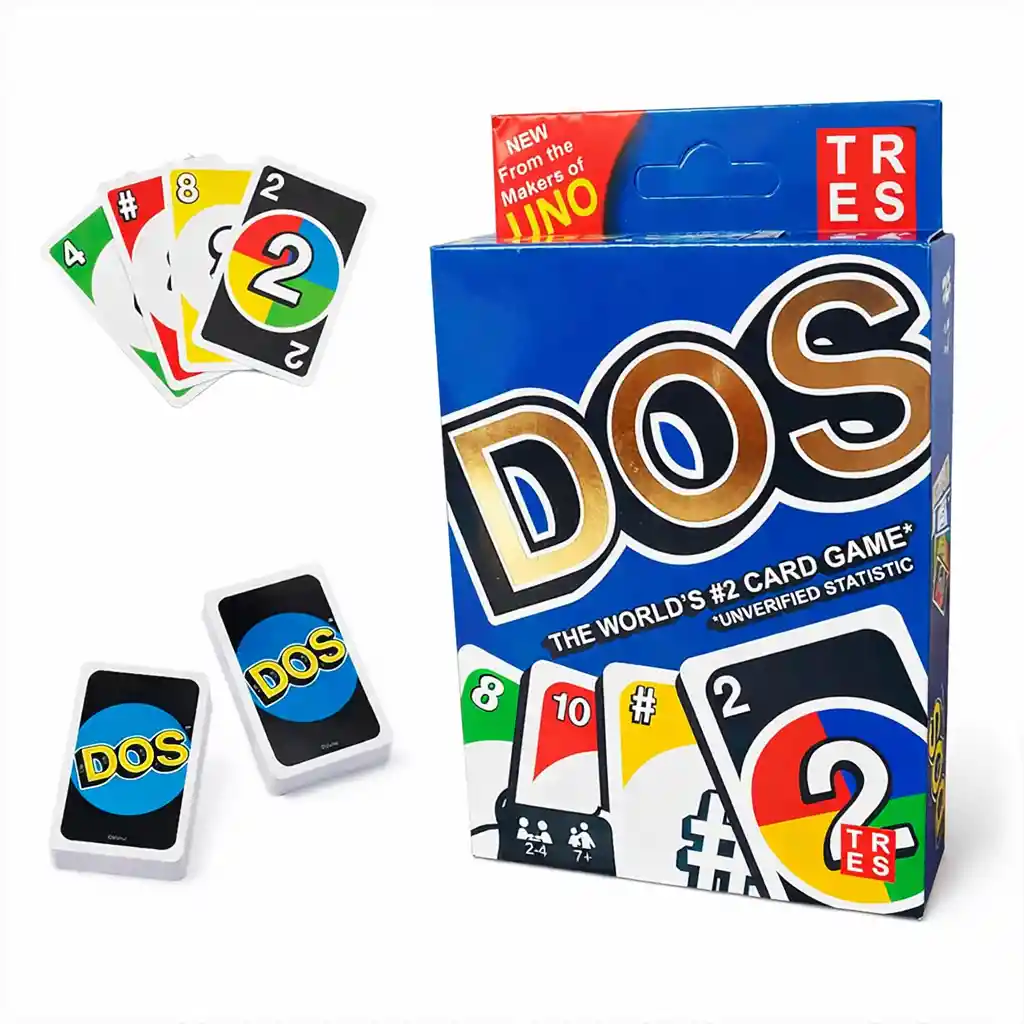 Cartas DOS – Juego de Mesa Clásico y Familiar ¡La evolución del clásico llega con DOS, el juego de cartas que lleva la diversión al siguiente nivel! Perfecto para compartir en familia o con amigos, este juego combina estrategia, rapidez y mucha emoción en cada partida. Disfruta de nuevas reglas y dinámicas que hacen cada ronda más emocionante y desafiante. El objetivo sigue siendo el mismo: ¡ser el primero en quedarse sin cartas! 🎯 ¿Cómo se juega? - Descarta tus cartas combinando número o color en cualquiera de las dos pilas de descarte. - Usa las cartas comodín “2”, que pueden jugarse con cualquier color, manteniendo su valor numérico. - Aprovecha las cartas especiales para cambiar el rumbo del juego y sorprender a tus oponentes. ¡No olvides gritar “¡DOS!” cuando te queden solo dos cartas!