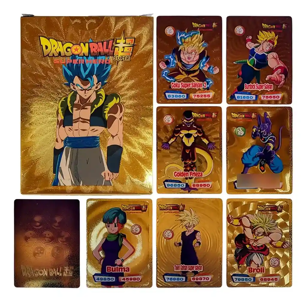 Te traemos este espectacular set De cartas Metalizadas De dragón ball super Son 54 cartas Coleccionables Cada carta tiene un puntaje de ataque y energía Para colecciónar Y para divertirse jugando