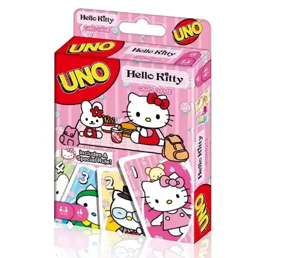 El clásico juego de cartas UNO ahora con un adorable diseño de Hello Kitty. Esta baraja de 108 cartas mantiene los colores tradicionales (rojo, verde, azul y amarillo) con ilustraciones exclusivas del icónico personaje. Modo de juego: Cada jugador recibe 7 cartas y el resto se deja en un mazo boca abajo. El objetivo es quedarse sin cartas, combinando el color o número con la carta en juego. Si un jugador queda con una sola carta, debe decir "UNO" para ganar.