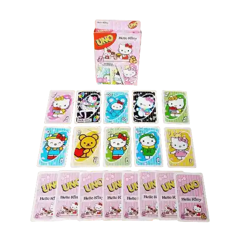 El clásico juego de cartas UNO ahora con un adorable diseño de Hello Kitty. Esta baraja de 108 cartas mantiene los colores tradicionales (rojo, verde, azul y amarillo) con ilustraciones exclusivas del icónico personaje. Modo de juego: Cada jugador recibe 7 cartas y el resto se deja en un mazo boca abajo. El objetivo es quedarse sin cartas, combinando el color o número con la carta en juego. Si un jugador queda con una sola carta, debe decir "UNO" para ganar.