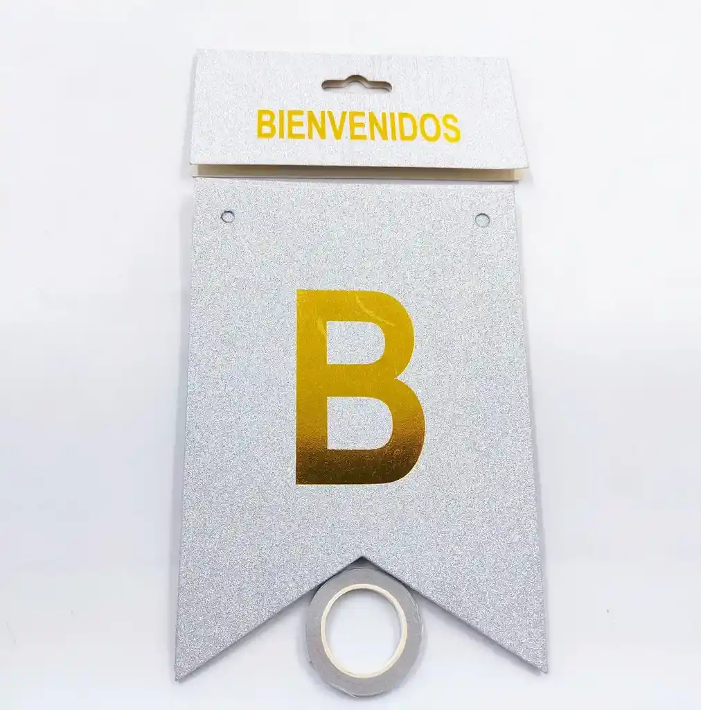 Guirnalda de Bienvenidos o Bienvenidas en color plateado para colgar ideal para recibir esos seres queridos practico y facil de armar