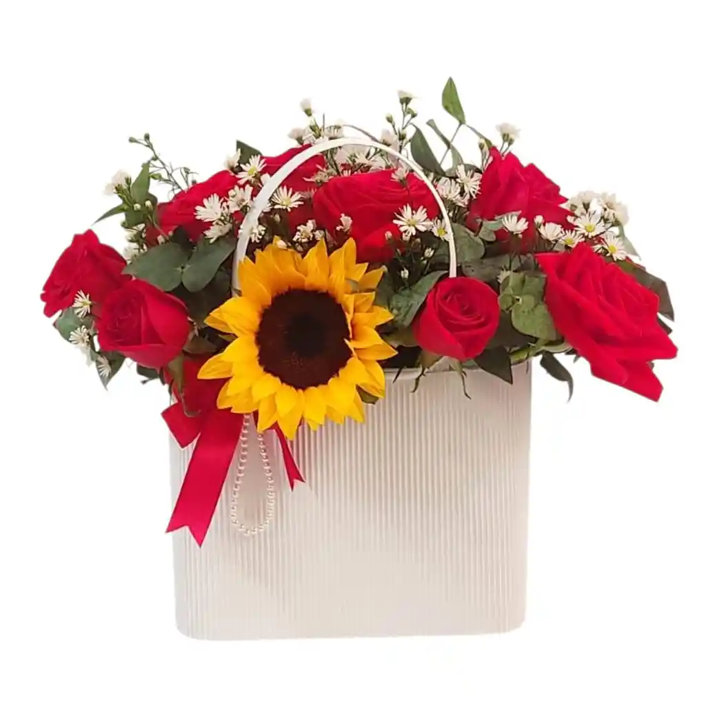 Caja en forma de cartera adornada con rosas, girasol, follaje verde y aster