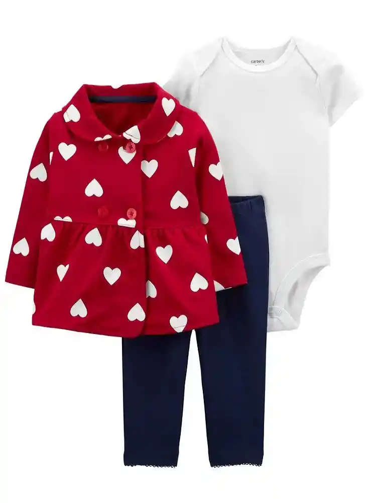 Conjunto Incluye Carter's Abrigo 1 Und + Carter's Pantalón 1 Und + Carter's Body 1 Und. Confeccionado en Suave Algodón; Este Adorable Conjunto se Completa Con un Cárdigan Con Estampado de Corazones; un Body de Manga Corta y Pantalones Sin Cordones.