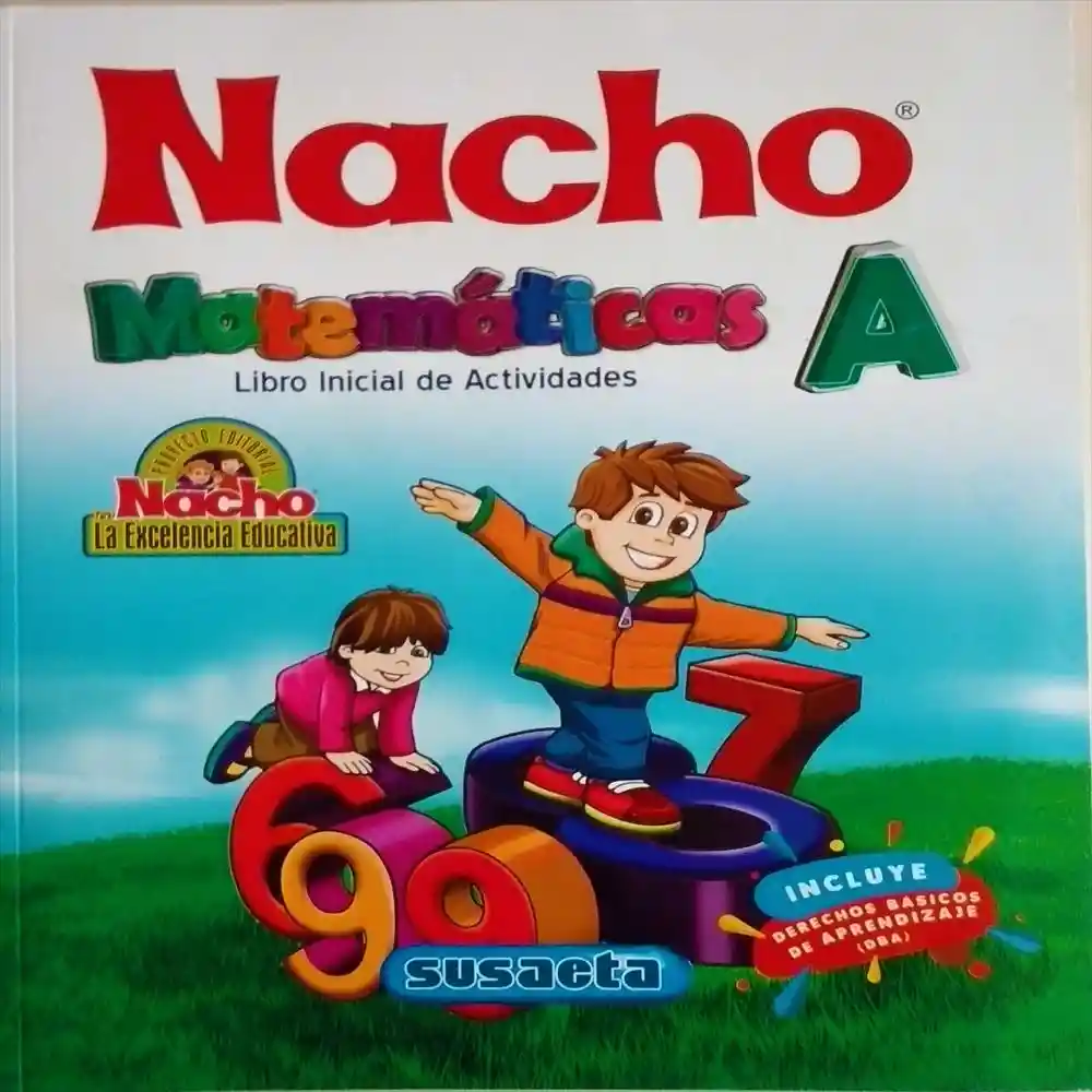 Nacho Libro Inicial de Matemáticas Tamaño: 19 x 24 cm * 96 páginas. ESTA CARTILLA INCLUYE: • Actividades orientadas y referidas a los estándares curriculares: Pensamiento espacial. sistema numérico operatorio. razonamiento matemático. Sistemas geométricos. etc. • Actividades que estimulan el desarrollo de procesos y del pensamiento lógico. • Actividades de evaluación basadas en el modelo de Pruebas Saber. -Ediciones: Susaeta. ISBN: 9789580715351