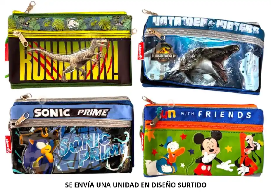 Una genial Cartuchera 3 Bolsillo Personajes Niño Primavera , fabricada con materiales de alta resistencia, cierre con Cremallera, parte frontal impresa, Sin Forro, material 100% poliéster,, excelente para llevar todos tus implementos escolares. SE ENVÍA UNA UNIDAD EN DISEÑO SURTIDO.