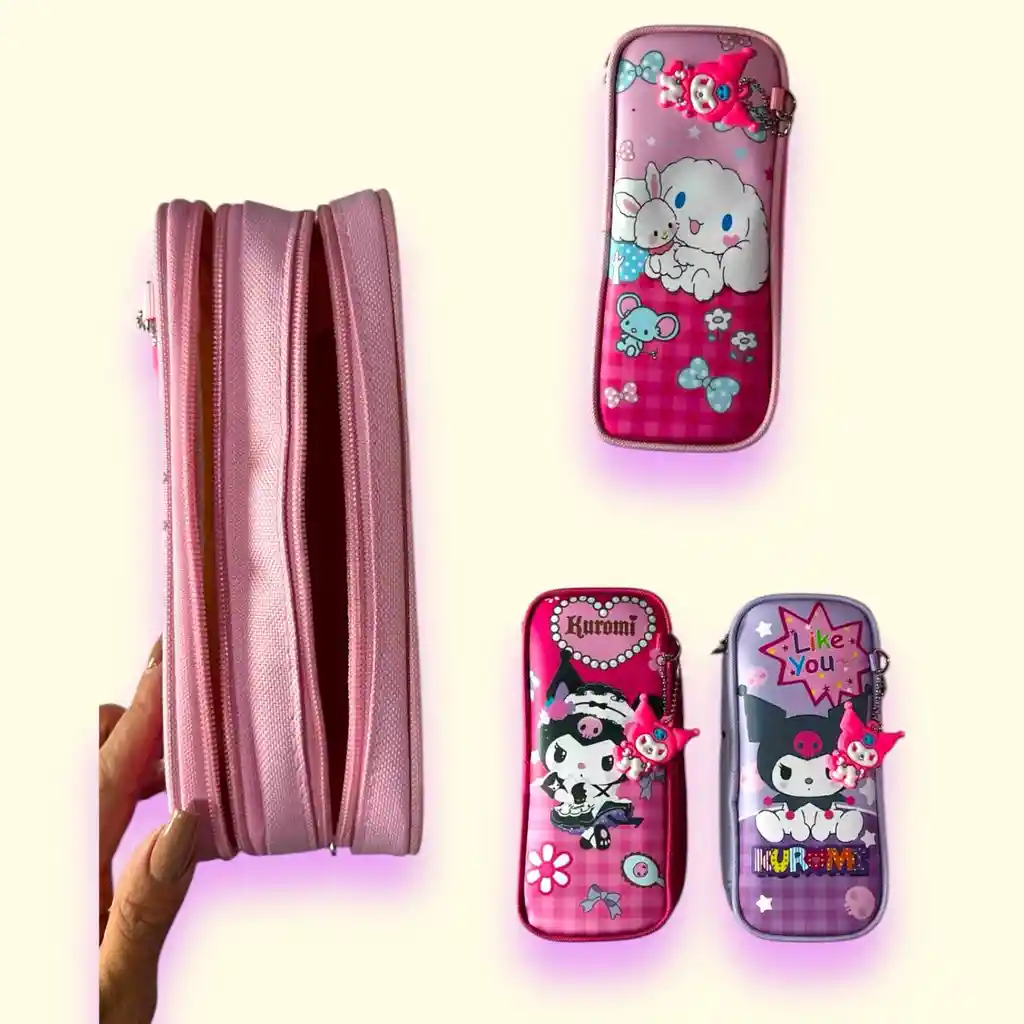 Cartuchera del motivo Sanrio la cual viene acolchada y con doble compartimento por lo que permite llevar más esferos colores y útiles de oficina. Cada división viene con una cremallera independiente.